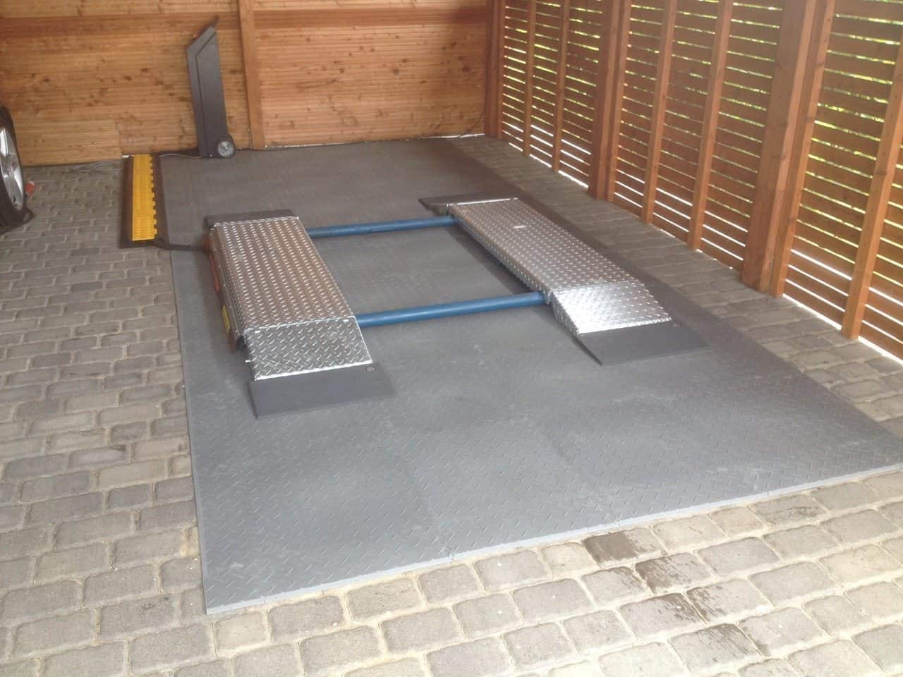 Także właściciel serwisu samochodów poszukiwał takiej posadzki dla swojego zadaszonego miejsca, na którą by można było umieścić niezbędne urządzenia i wyposażenie. Płytki PCV Fortelock poradzą sobie również z nadmiernym obciążeniem, wyciekami płynów eksploatacyjnych, a w dodatku są łatwe w czyszczeniu. Zdjęcia pokazują, że posadzka została położona na pierwotną podłogę z kostki brukowej. Nie wymagało to żadnego klejenia lub śrubowania.